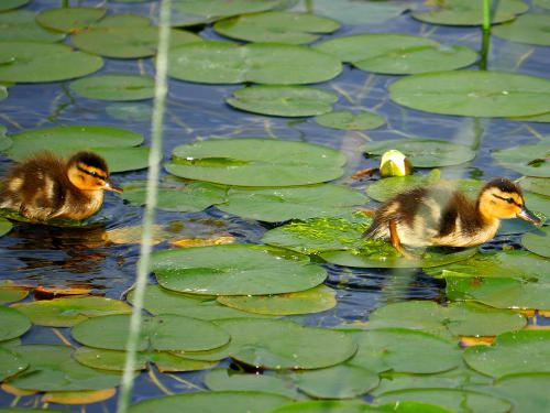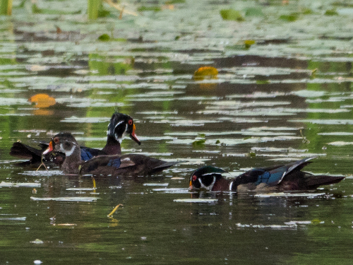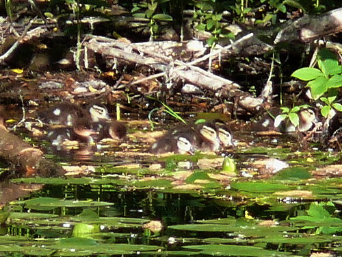 Some of the 8+ Wood Duck babies with 2 (of 3) Hooded Merganser ducklings |