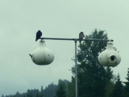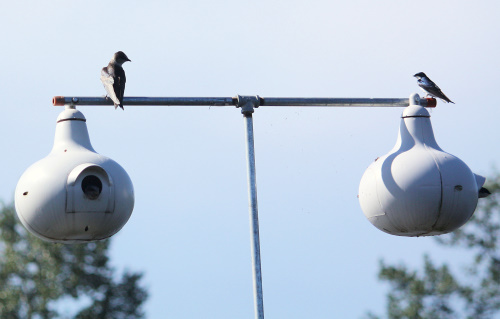 Female Purple Martin in the left gourd. Female Tree Swallow in the right gourd.