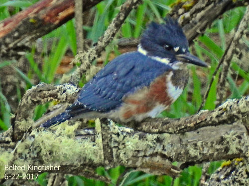 - Belted Kingfisher – Three apparent juveniles perched together low along the slough; a fourth kingfisher was seen flying, probably a parent trying to catch enough food