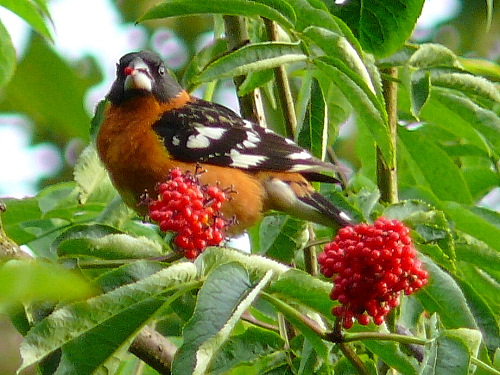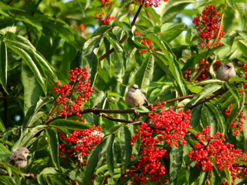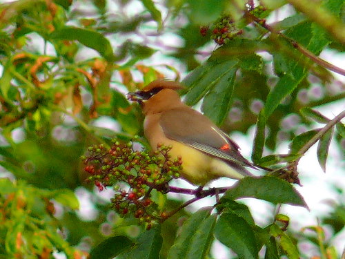 Cedar Waxwing eating the ripest of the Red Elderberry berries