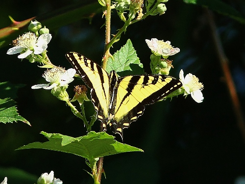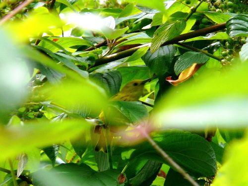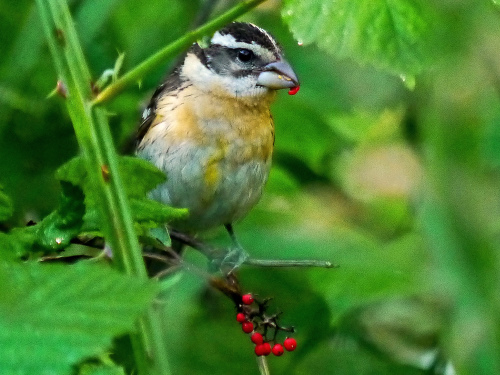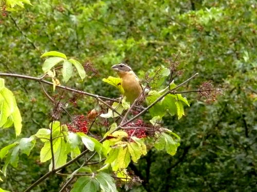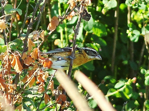 On a small, dead-topped elderberry in the Dog Meadow were a male AMERICAN GOLDFINCH, a male BLACK-HEADED GROSBEAK, and a male COMMON YELLOWTHROAT.