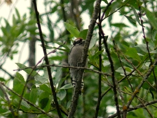 Our second highlight was truly unexpected. At the south end of the dog area we heard the squeaking of a juvenile bird begging. We were shocked to find a baby BROWN-HEADED COWBIRD being fed by at least two BUSHTITS. Looking a little bit into the literature, this appears to be extremely rare (10 reports as of 1989, according the article cited below), with most of those being documented by examination of the eggs within the nest. Bushtits actually feeding a cowbird may be even rarer, though the authors indicate that the host providing food to a cowbird may not be the same species as the hatching host. I have a hard time imagining a cowbird being able to leave an egg in a bushtit nest, though it apparently is possible. See http://elibrary.unm.edu/sora/wb/v21n01/p0035-p0036.pdf