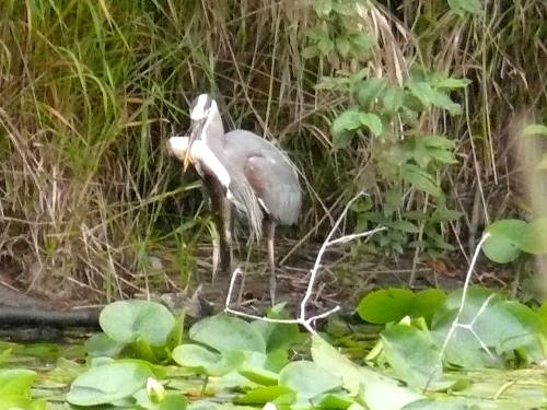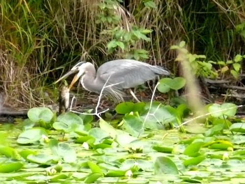 A GREAT BLUE HERON spent more than 10 minutes (at which point I dragged the group off to continue our walk) trying to eat an absolutely enormous fish - maybe a bullhead. The fish must have been a foot long, and looked clearly too big around for a heron to swallow.