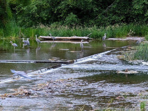Nine juvenile Great Blue Herons at the weir. Photo by Michael Hobbs