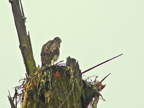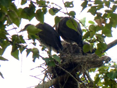 The heronry is substantially emptier. The dead tree that has several nests had just 5 juveniles on nests today, where we had 20 two weeks ago. At the weir, however, in a very small area we found at least 15 juveniles standing in the water, waiting for fish to jump into their mouths. Another juvenile was low in a cottonwood, looking up, since up is where fish have always appeared...