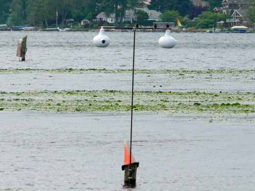 Last Saturday, my son Tim and I put up two more gourds for PURPLE MARTINS on a piling visible from the lake platform. Today, a female (and later a male) was in the leftmost of the near (old) gourds, and three martins were perched on the crossbar of the new gourd pair. All together, I think we saw 6 martins from the lake platform. On Saturday, Tim and I also canoed over to the northeast corner of the lake, where I was surprised to see that someone had put up some new boxes, and possibly cleaned and refurbished some of the old boxes. In a very quick scan, we found martins in at least 6 of those boxes. So a banner year for nesting Purple Martins at Marymoor!
