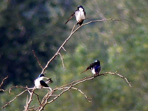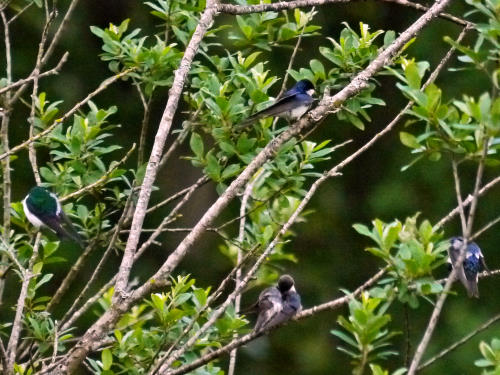 Violet-green Swallow (left) with Tree Swallows. Photo by Ollie Oliver