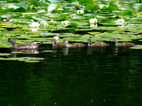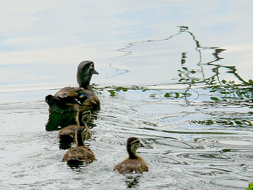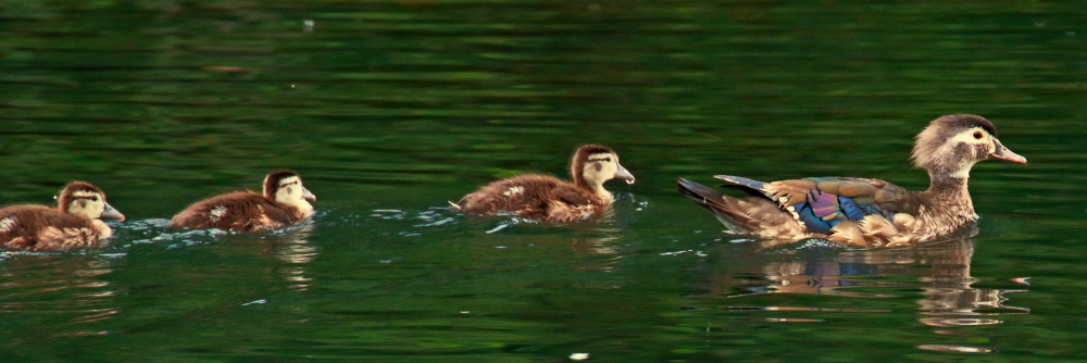 - Wood Duck - Female with four very small ducklings, from the Rowing Club dock