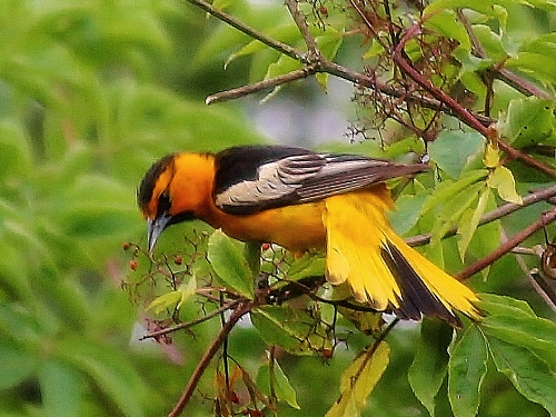 BULLOCK'S ORIOLE: Brian noted "2 or 3 males, female, several young being fed, including one without a tail"