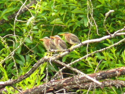 The five fledged GREEN HERONS were at the main pond at the Rowing Club, flying (and especially landing) awkwardly. One was thinking about trying to fish, but was working from a branch too high above the water. The rest seemed willing to wait for Mom or Dad to deliver. An adult did arrive and was mobbed.