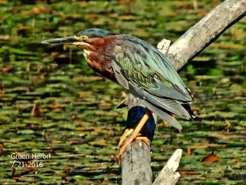 - Green Heron - Two present, and heard them call about 4 times. Slough below the weir, and later from the Lake Platform