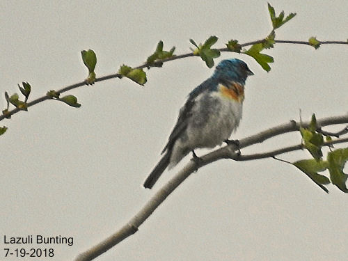 - Lazuli Bunting - One singing male, northwest corner of Dog Meadow near portapotties