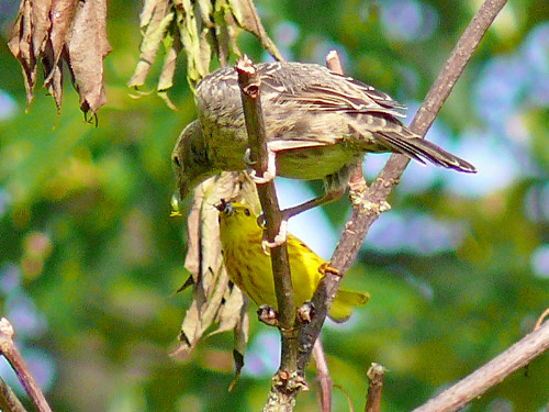 Male Yellow Warbler feeding juvenile Brown-headed Cowbird.