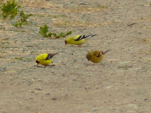 2 male and 1 female American Goldfinch on the path next to the East Meadow |