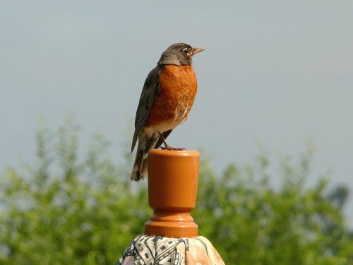 American Robin atop an umbrella at the Community Gardens |