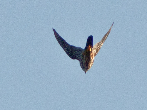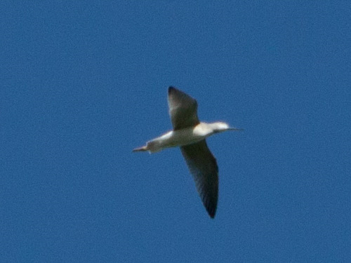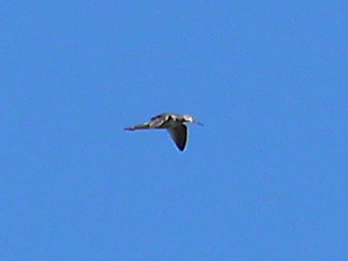 A late scan of the lake turned up a couple of surprises while I was checking the identity of a couple of gulls (Glaucous-winged, and a hybrid). First, a MERLIN darted towards the Lake Platform only to be driven off by a dozen or so IRATE PURPLE MARTINS. Then, I had a fly-by of four small, brownish shorebirds. My guess is LEAST SANDPIPER, which is also the most seasonably reasonable brownish shorebird.