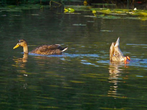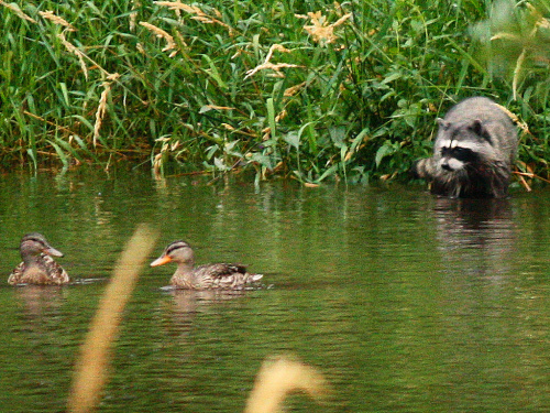 Raccoon eying Mallards. Photo by Lillian Reis, 2010-07-28 |