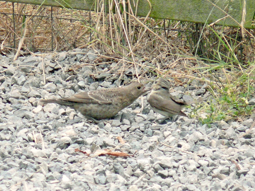 Several juvenile BROWN-HEADED COWBIRDS being fed; towhee, song sparrow, and junco may all have been subjected to this chore.