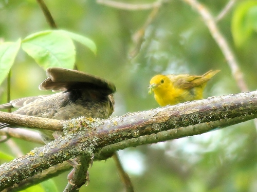 VIREO feeding a baby BROWN-HEADED COWBIRD. Great looks, but...