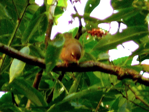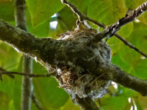 We were long-delayed near the Dog Area portapotties, trying to track down a continuously-repeated two-syllable call coming slightly more often than every two seconds. The repetitious calling was suggestive of Hutton's Vireo, only pitched lower and slightly slower, perhaps. MERLIN was useless, occasionally identifying it as Red-eyed Vireo.