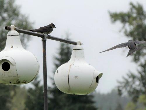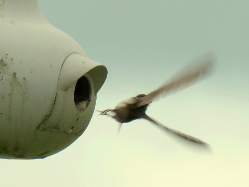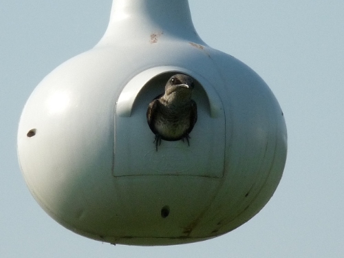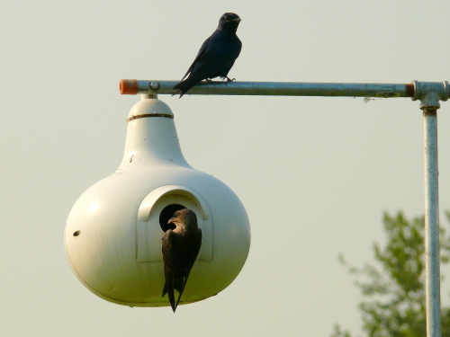 At least in the left gourd, the Purple Martins are feeding one or more young |