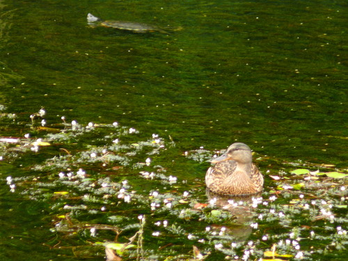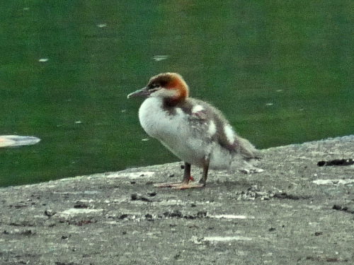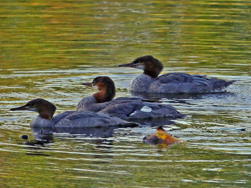 - Common Merganser - Female with 5 large ducklings fishing the slough and weir area