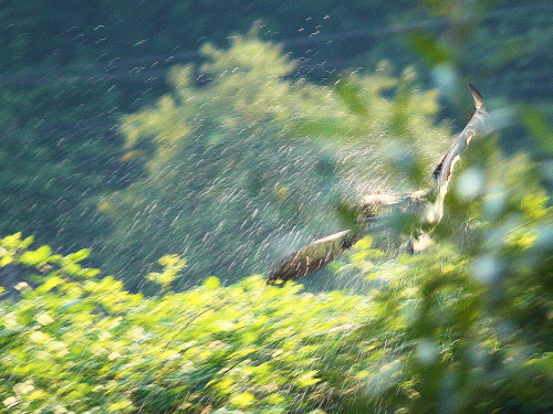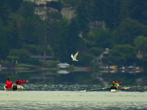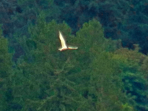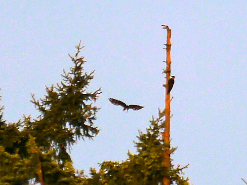 At one point, there were two OSPREY perched in large firs near the mansion, calling incessantly. Juveniles? Two more Osprey flew northward, ignoring the youngsters. Then another Osprey came flying north with a fish, again ignoring the two in the tree. At least 1 Osprey was at the nest platform for much of the day, and multiple birds were seen over the lake. Hard to count...