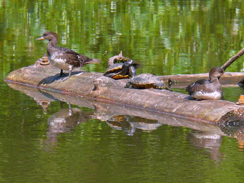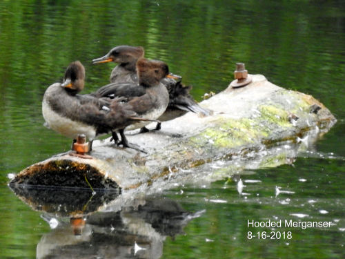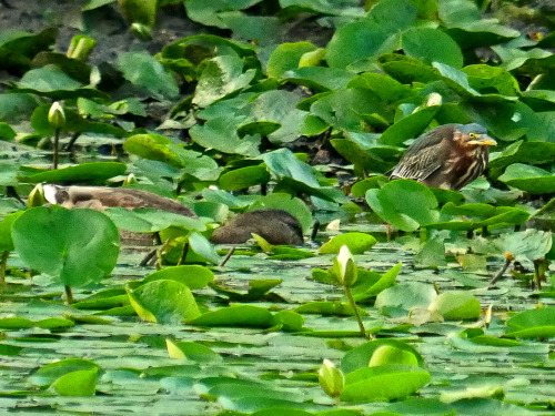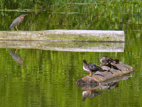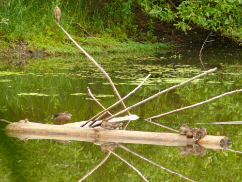 Green Heron (top left), Blue-winged Teal (bottom left), Hooded Merganser