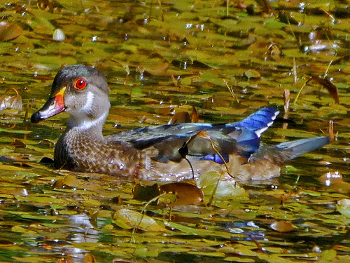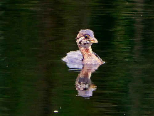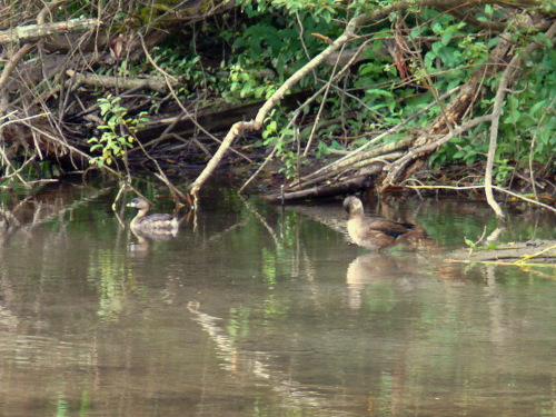 Adult Pied-billed Grebe with Wood Duck, in slough