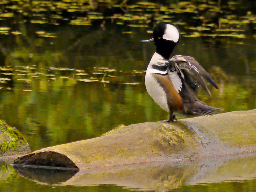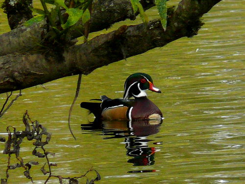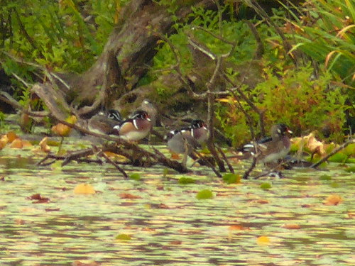 A bunch of male Wood Ducks with an American Coot (center, facing left) |