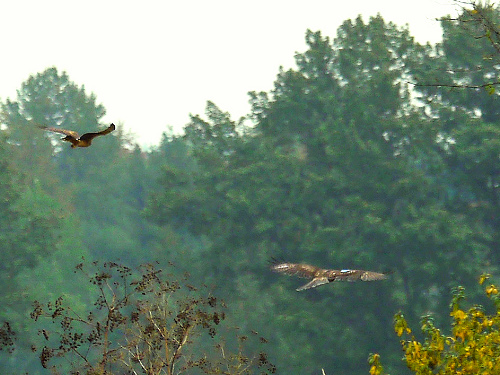 Today was the first time we've had multiple vultures in trees. In fact, it may well be the first time we've had ANY vulture in a tree. I searched through checklist comments as well as all the photographs, and none indicate perching. And this was just the 5th time with more than 5 vultures reported. Three times we've had 20+ kettling. All of these 5+ days have been between Sept 21 and Oct 6.