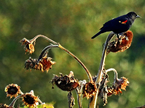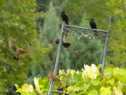 Two adult male, one juvenile male, and two female Red-winged Blackbirds |