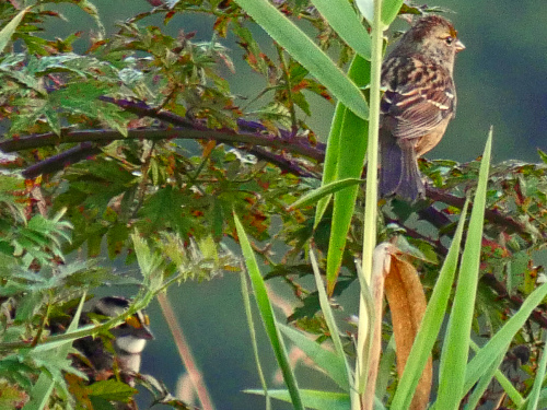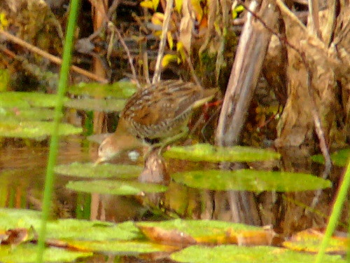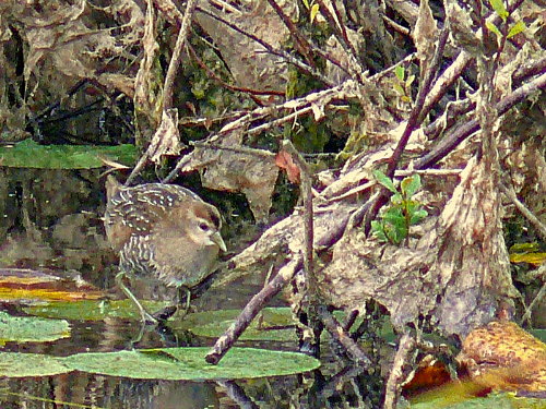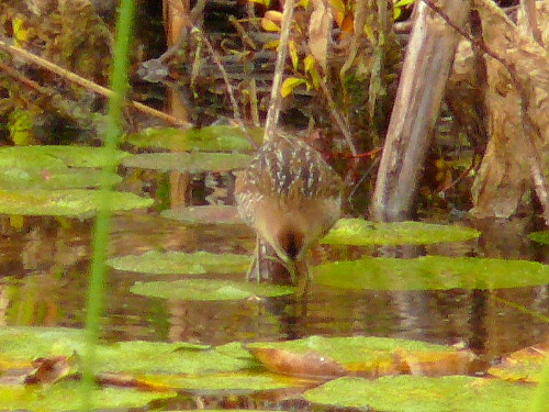 The big highlight was a juvenile SORA that gave us great views from the lake platform. The bird was along the edge of the vegetation on the slough side of the base of the platform, and we had at least 10 minutes to view it. Thanks, Mark, for spotting this one.