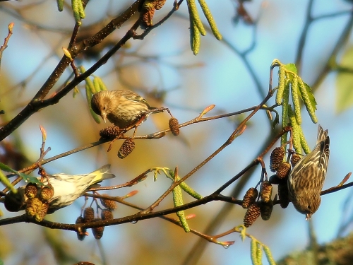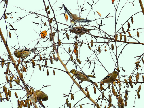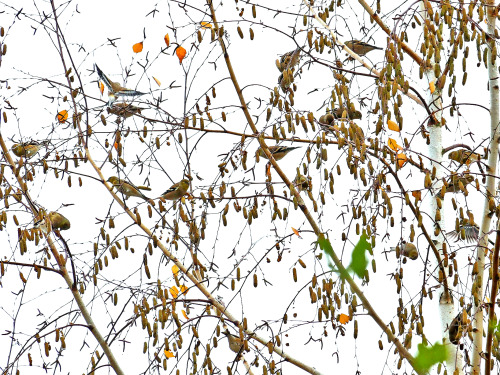 Pine Siskins in a Red Alder. Photo by Lillian Reis