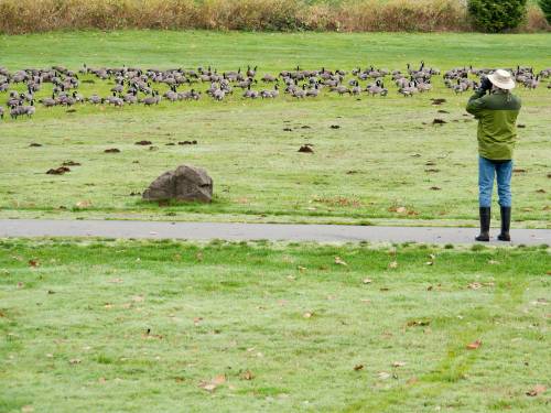 Michael scans the flock of ~250 Cackling Geese. Two had yellow neck bands; the birds were hatched prior to 2010, and banded in 2011 near Chevak, AK, in the Yukon River NWR. At least one of the two collared birds was seen at Marymoor last winter.