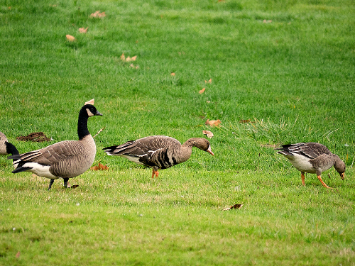 Cackling Goose with adult (left) and juvenile Greater White-fronted Geese.
