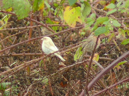 Leucistic House Finch, seen from Viewing Mound. |