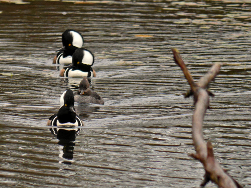 Duck numbers are still way down. We had less than 10 Mallards, maybe 5 Bufflehead, and 4 Hooded Merganser, plus 1-2 probable Goldeneyes. That was it for ducks.