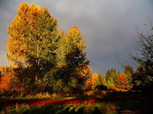 Weird weather was the most notable thing this morning. It was overcast to start, and fairly warm. Just before 8:00, we had ten seconds of dramatic sunlight streaming down on the last of the beautiful fall foliage, but with deep, dark clouds in the background. We had moments of sprinkles, but the rain held off until 11:00. Between 8:00 and 10:00, we were periodically hit by puffs of incredibly warm air, occasional puffs of cold air, and sometimes both within seconds. The wind picked up gradually, though it faded about when the rain started, thankfully.