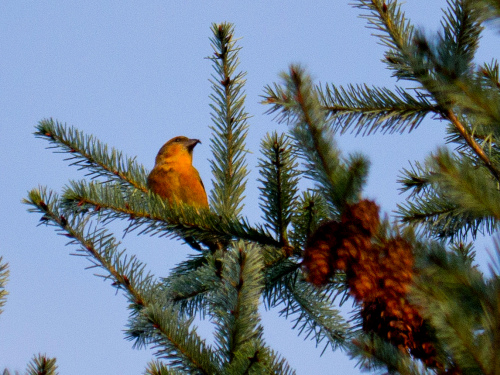 Red Crossbill in the early morning sun, above the Mansion. Photo by Ollie Oliver
