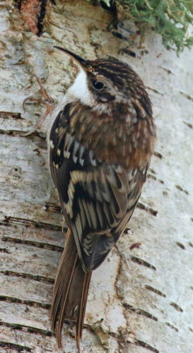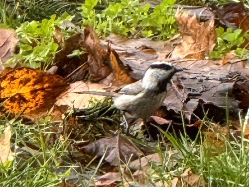 The MOUNTAIN CHICKADEE was at the edge of a large group of birds near the mansion. The ground there is absolutely covered in downed twigs, branches, leaves, and cones that fell during the wind storm. There were BLACK-CAPPED and CHESTNUT-BACKED CHICKADEES, RUBY-CROWNED and GOLDEN-CROWNED KINGLETS, PINE SISKINS, and DARK-EYED JUNCOS feeding on the ground. A BROWN CREEPER was seen as low as 3 inches off the ground at the base of a tree. Dozens of very active birds in all, and then Emily spotted the Mountain Chickadee which was also dropping from a branch to the ground and returning to the tree about 15 feet away from us!