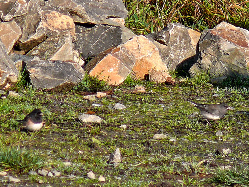 Dark-eyed Juncos - male "Oregon" at left, female "Slate-colored" on right.