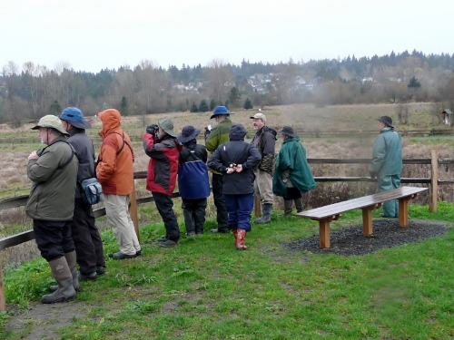 I made an impromptu trip out to Marymoor this morning. It was interesting to do the loop solo for a change, instead of with a dozen people. I missed the extra ears and eyes. There was a heavy overcast, and a steady breeze. No rain, but the air was damp. The barometer was probably falling, and birds were scarce and hard to see.