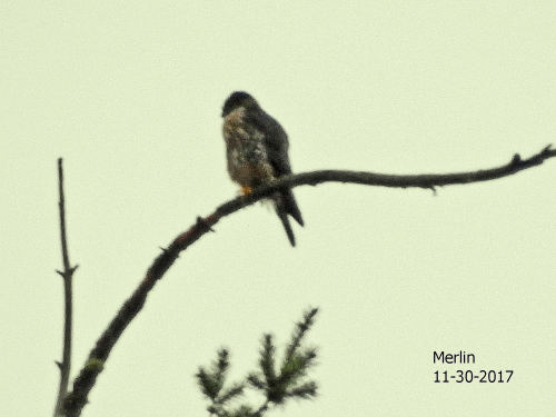 Cooper's Hawk Both and adult and a juvenile Merlin Brief view of bird flying north chased by a crow Hairy Woodpecker One on the far side of the slough at the lake platform Fox Sparrow Several nice looks Townsend's Warbler One NE of mansion Pine Siskin 100+