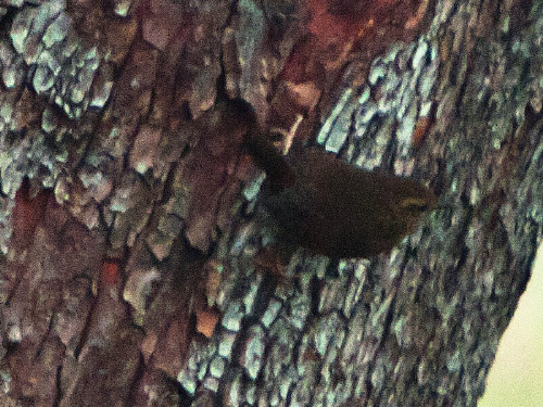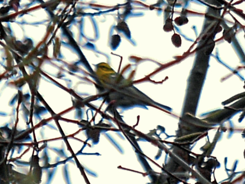 Cloudy and windless, temps just above freezing to start. The rain held off, but we often experience what we had today: forecast of an imminent big storm and the birding rather poor. You'd think they'd be frantically active before the deluge, but no; maybe they're moving to better locations to weather the storm? Some notable sightings today, but many of them extremely fleeting.