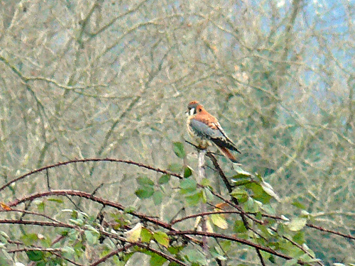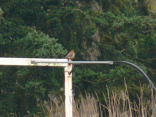 We found a very nice male AMERICAN KESTREL that seemed to have an ffinity for the corners of soccer goals - it roamed the whole of the grass soccer field area, mostly landing only on the corner posts.