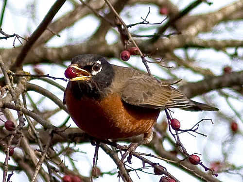 American Robin eating haws from a European Hawthorn, 2009-12-05.