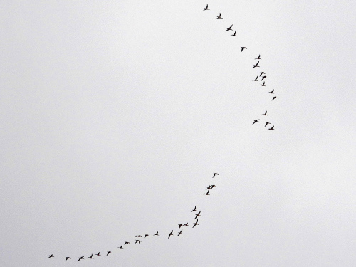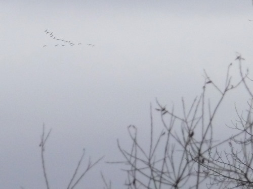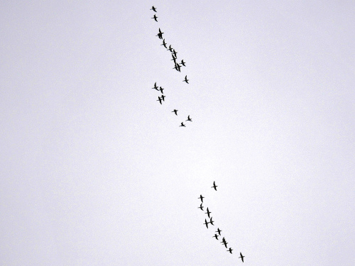 Nearing 9:00 a.m., a flock of 10 TRUMPETER SWANS flew overhead, towards Lake Sammamish Minutes later, another flock of 41+ flew past, followed by a flock of 14, for a total of at least 65 SWANS!