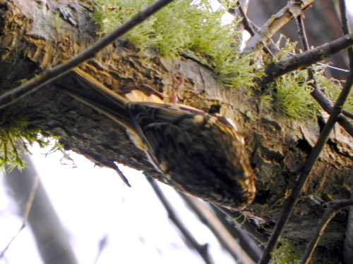 Brown Creeper on the underside of a branch. Photo by Michael Hobbs