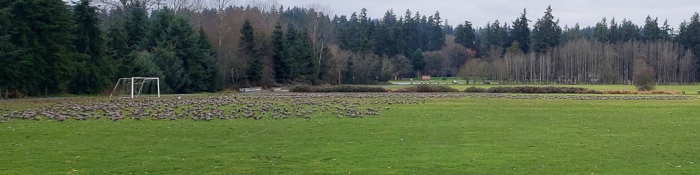 As we gathered at 8:00, huge flocks of (primarily) CACKLING GEESE flew overhead, all looking for a place to land, then deciding not to stop at Marymoor. My estimate is 2000 geese, by far the most we've had of that species ever. There were probably a dozen large flocks, often multiple flocks overhead at once, plus countless small flocks of ~20. Late in the morning, Matt found some on the ground in the park, amongst which was a single GREATER WHITE-FRONTED GOOSE.